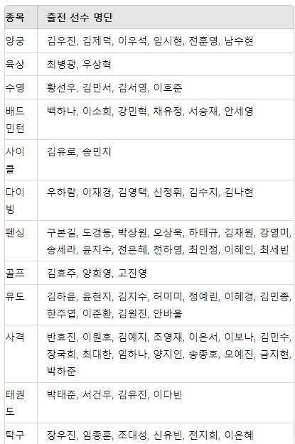 대한민국은 양궁, 유도, 수영, 골프, 배드민턴 등 총 22개 종목에 출전합니다. 각 선수와 팀은 철저한 준비와 훈련을 통해 금메달을 목표로 경쟁할 예정입니다.
