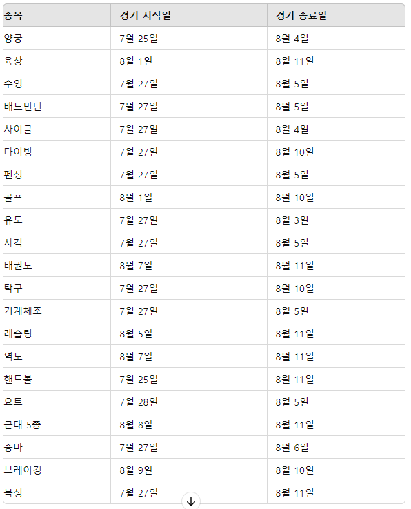 - 태권도와 유도: 각각 8월 7일부터 8월 11일, 7월 27일부터 8월 3일까지