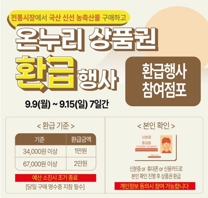이번 추석을 맞이하여, 온누리상품권이 특별한 10% 할인 이벤트를 진행합니다. 기존의 할인율에서 더욱 상향된 이 할인은 9월 한 달간 유효하며, 구매 한도가 200만 원으로 확대되어 더욱 많은 상품을 경제적으로 구매할 수 있는 기회를 제공합니다. 이번 기회를 통해 명절 대비용 쇼핑을 계획하시는 분들에게 매우 유익할 것입니다.