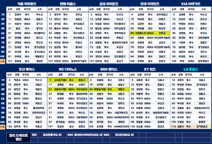 - 이어서 삼성 라이온즈, 롯데 자이언츠, KIA 타이거즈 등도 각자의 첫 선택권을 사용해 필요한 포지션의 선수들을 선발했습니다.