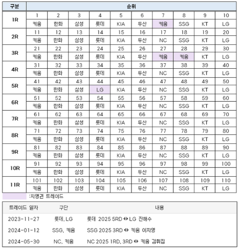 - 키움 히어로즈는 첫 번째로 정현우 선수(덕수고, 좌완투수)를 선택하며, 그의 강력한 구속과 제구 능력에 큰 기대를 걸었습니다.