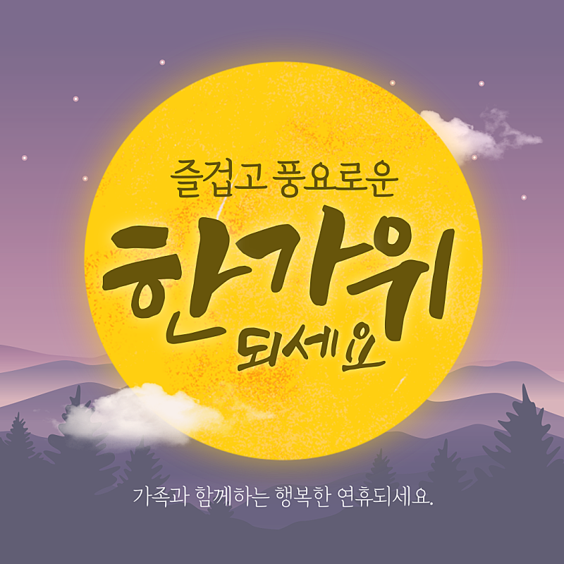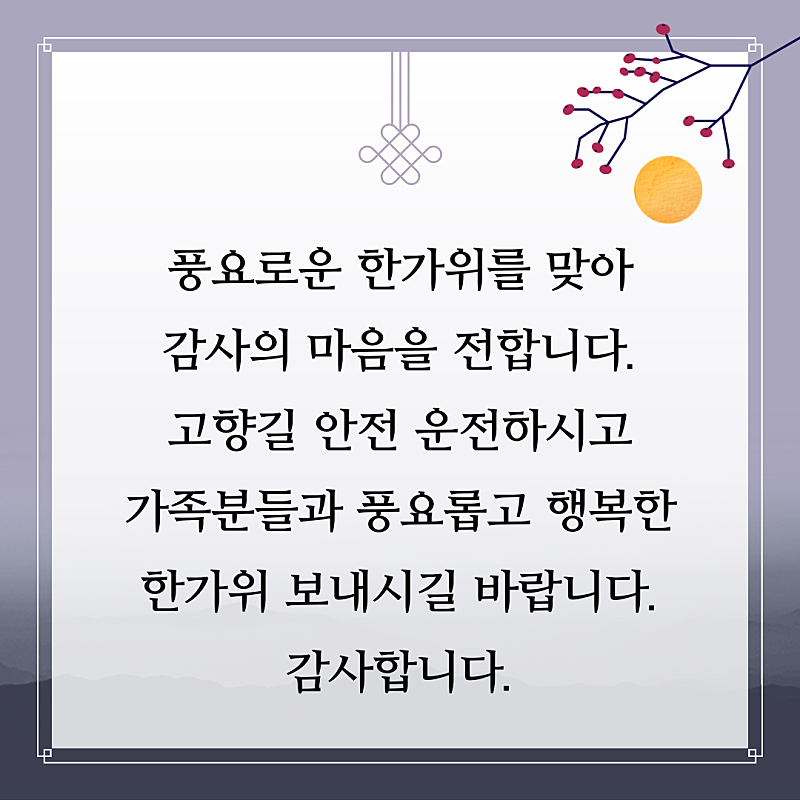 - "추석 명절, 마음도 풍성하게! 지인님과 가족 모두 건강하고 즐거운 한가위 되시길 바랍니다."