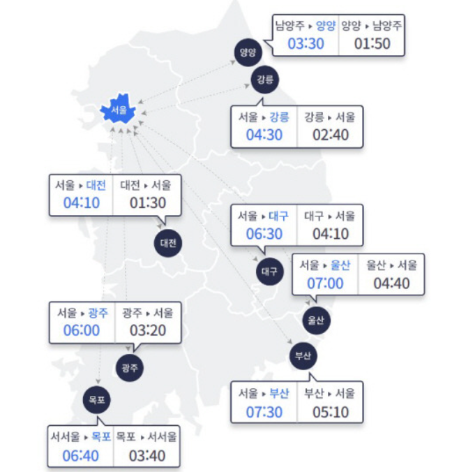 - 대전: 서울에서 대전까지 약 4시간 10분 소요