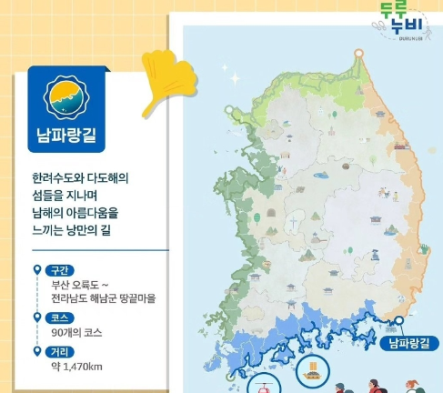 - 남파랑길 (남해안): 2020년에 개통된 남파랑길은 남해안의 따뜻한 기후와 아름다운 섬들을 경험할 수 있는 1470km의 코스입니다.