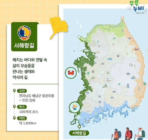 - 서해랑길 (서해안): 2022년에 완성된 서해랑길은 서해안의 고즈넉한 풍경을 따라 1800km에 이르는 긴 여정을 제공합니다.