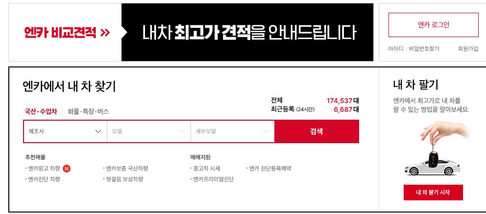 - SK엔카는 한국에서 가장 잘 알려진 중고차 매매 사이트 중 하나로, 사용자 인터페이스가 매우 친절합니다. 대규모 인벤토리를 자랑하며, 모든 차량은 전문가에 의해 사전에 검사를 받습니다. 또한, 다양한 필터링 옵션을 통해 차량을 쉽게 검색할 수 있습니다.
