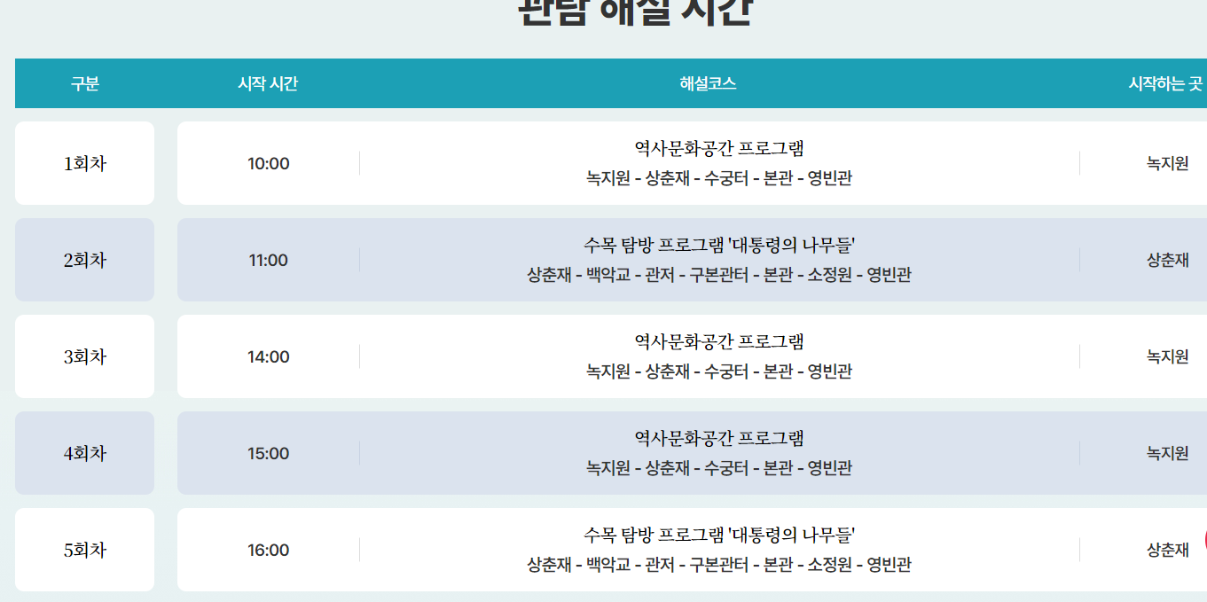 청와대 관람 휴무일은 매주 화요일 입니다. 관람 시간은 하루 6회 차로 구분되어 있습니다. 청와대 관람 입장료는 무료 입니다.