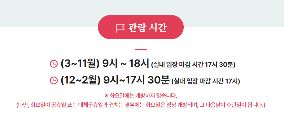 - 12월부터 2월까지는 9시부터 17시30분가지 입니다.