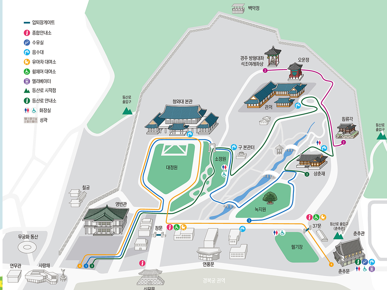 아니면 국립고궁박물관 정류장에서 01번 버스 승차 후 청와대 정류장 또는 춘추문 정류장에서 하차.