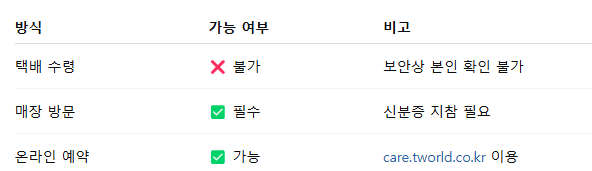 - 예약은 care.tworld.co.kr에서 가능하며, 본인 인증 후 희망 매장을 선택하여 예약할 수 있습니다.