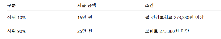 - 하위 90%: 15만 원 + 10만 원 = 총 25만 원 수령