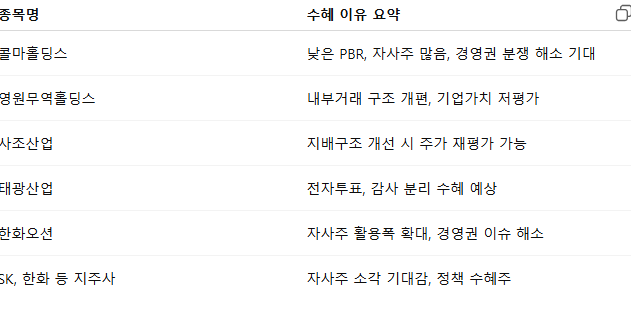 - 상법개정안 수혜주: 자사주 활용 및 지배구조 개선 여력 있는 기업군
