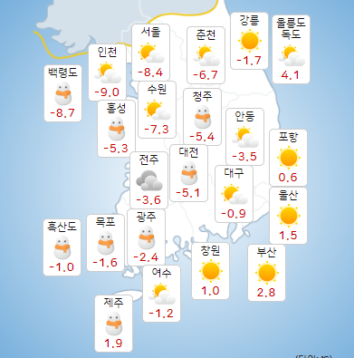 전국 날씨 예보 알아보겠습니다. 서울 날씨와, 부산 날씨, 대전 날씨, 대구 날씨 까지 알아보겠습니다. 1월이 되고 그래도 엄청난 한파는 없었던것 같은데요 어제 밤부터 많이 추워진것 같아요.