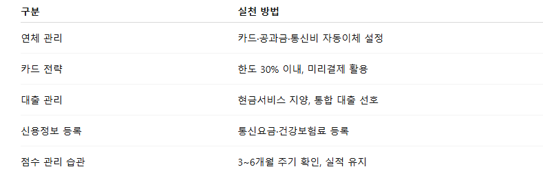 하지만 신용점수는 꾸준함과 신뢰를 기반으로 하는 지표이기 때문에, 무리한 방법은 오히려 리스크가 됩니다.