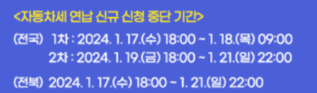 자동차세 연납 신규 신청 중단 기간도 있으니 꼭 확인을 하세요. 전국 1차 점검시간도 있구요 전국 2차 점검시간과 전북 점검시간이 따로 있습니다. 곡 점검시간 확인을 하세요.
