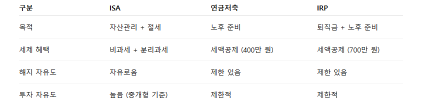 반면 연금저축과 IRP는 노후준비에 특화되어 세액공제가 크지만 인출 제한이 있어요.