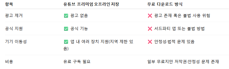 공식 방식인 유튜브 프리미엄 오프라인 저장이 가장 안정적이고 권장되는 방법입니다.