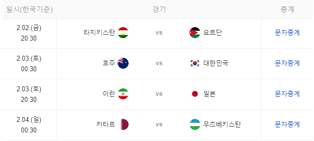 아시안컵 축구 경기일정 호주와의 경기는 2월3일 새벽 0시30분 입니다. 호주팀은 피지컬이 한국팀보다 좋다는 평가를 받는데요 우리나라 선수들이 투지는 대단하잖아요?? 기대를 하고 있습니다. 한국이 8강전에서 호주를 이기게 된다면 4강전에서는 타지키스탄과 요르단 중에 승자와 만나게 되겠습니다. 요르단과는 조별리그에서 만난적이 있습니다.