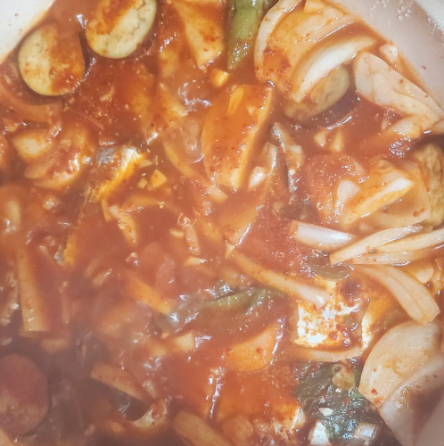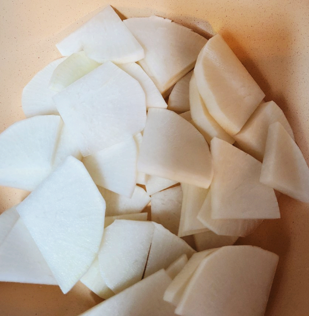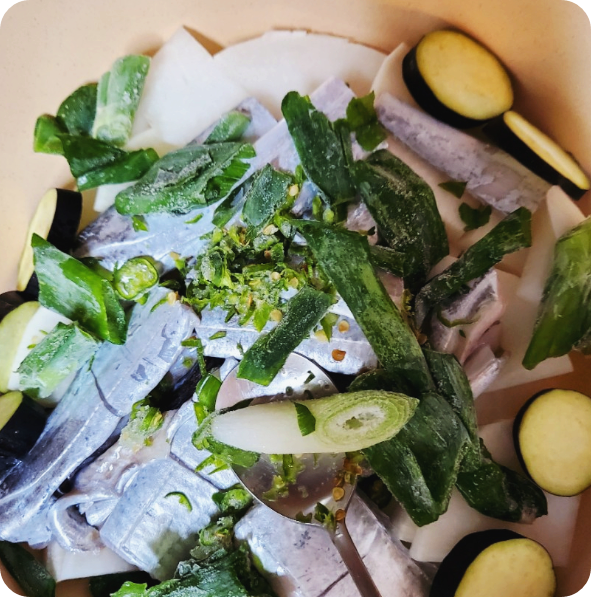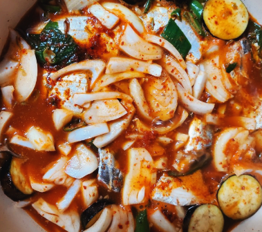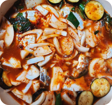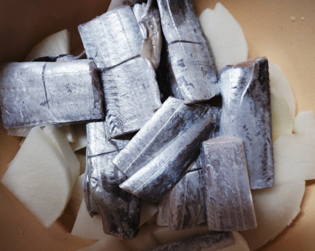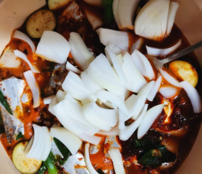 냄비에 넣는 순서는 무우부터 깔아주시는게 포인트 이라고 합니다. 생선부터 넣지 마시구요 무우를 깔아주시고 그 위에 갈치를 잘라서 넣어주세요. 그리고 양파나 다른 야채들 넣어주시구요.