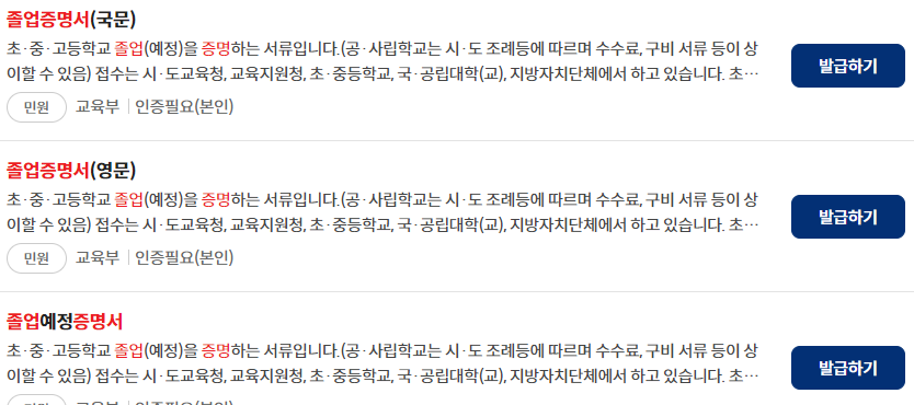 정부24 홈페이지에 방문을 해서 검색창에 대학교 졸업증명서를 치고 검색을 하고 대학교 졸업증명 신청 버튼을 클릭하면 신청이 가능합니다. 그리고 여기는 비회원으로 인증후에 신청이 가능하다는 장점이 있습니다. 초등학교부터 고등학교까지는 집에서 그냥 인터넷 발급이 가능하다고 하는데요 대학 졸업증명서는 행정기관에 가서 직접 가지고 와야 한다고 하네요.